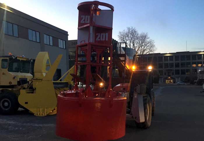 Originally 20 feet tall and six feet wide, the heavily rusted buoy weighed 6,500 pounds. Cummings staff wire-brushed it clean and removed the bottom stem and counterweight, resulting in its current height, a still-imposing 14 feet. After applying several fresh coats of bright red and white enamel paint and installing a white light at the top, six staff members maneuvered the historical artwork into place with the help of a telehandler, a piece of heavy equipment that is a cross between a crane and a forklift.